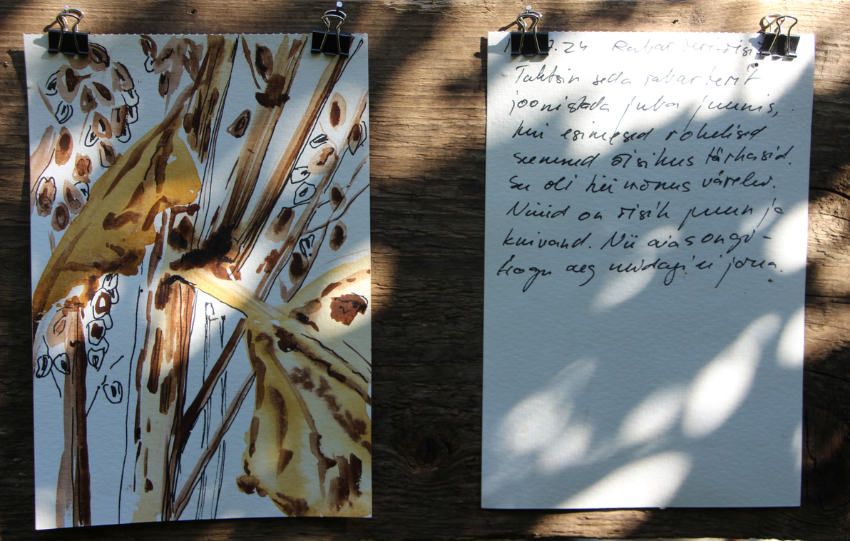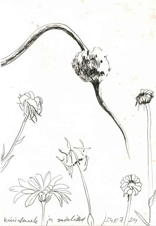 This method combines attentive observation and drawing of nature and writing down one's perceptions and feelings during the process, in other words – reflection about the situation. I have conducted this method myself as an artist and in some workshops in different gardens in Karula national park, Äksi and Tallinn. The method can focus either more on individual plants or on natural relationships. I will discuss the first way here and the latter one separately.