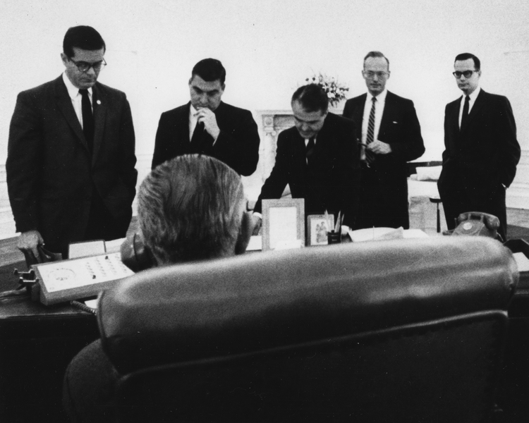 Lyndon B. Johnson’s earliest telephone recordings arose from his time as Vice President under Kennedy. After Kennedy was assassinated and Johnson inaugurated in November 1963, he extended recording systems to include the entire Oval Office and his ranch. He either pressed the record button himself, or his secretary did it for him.
