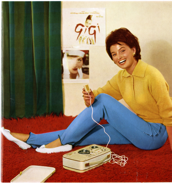 This is a recording made by Lady Bird Johnson in 1968, the last year of Johnson’s presidency. The public criticism levelled at Johnson during the Vietnam War made re-election unlikely, and he did not run as a candidate. Lady Bird Johnson dictated her diary onto tapes in the White House. The picture shows a woman in a living room using tape recording technology, the kind of scene described in the 1960 BASF brochure. In terms of iconography, this is the same type of image as shown in the 1960 Grundig brochure.