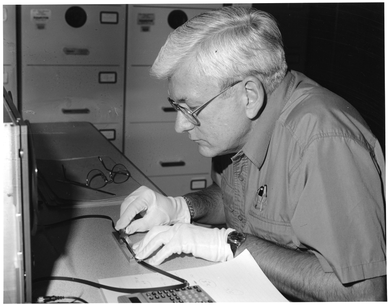 Figure 5 and 6: Audiovisual Preservation Specialist Bill Cowell (a NARA employee), demonstrating the work of cutting out the personal conversations from the Nixon Tapes (1998). The Richard Nixon Presidential Library and Museum (National Archives and Records Administration). Photo by Michael Carter.
