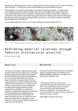 This practice-led research exposition by architect-researcher Elina Koivisto explores how conducting architectural practice through the framework of feminist spatial practice can provide possibilities for un-learning harmful habits and reaching towards uncertain speculative futures. The case study project Kudos – Library for Material Relations realized in Espoo, Finland as a co-creative process between human and non-human participants, provided a lens through which the current material and social relations in architecture-making were challenged, applying the conceptual thinking of posthuman feminist thoughts on care and interconnectivity. Reflecting on the project, architecture is seen as a tool for feminist becomings rather than as a producer of mere artefacts, and meaning and significance are found in the process of its making.