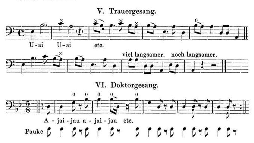 According to Stumpf, the resulting notation had a great advantage: it was easy for the European reader to understand. Not surprisingly, he did not believe that his notations would ever need to make sense to a member of the “Bella Coola Indians.” Stumpf explained this in a later article, in which he compared his own notational style to that used by Benjamin Ives Gilman when commenting on Native American melodies collected by J. Walter Fewkes. Gilman, a former student of Charles Sanders Peirce, had also used European music notation, but unlike Stumpf, he wrote the melodies in such a way as to defamiliarize them for the European gaze. He achieved this by arbitrarily attributing new meanings to the available signs, including the accidentals. The resulting melodies looked as if they had arisen from a modernistic composing style with a preference for remote tonalities and were, accordingly, difficult to decipher (Stumpf 1892: 131).
