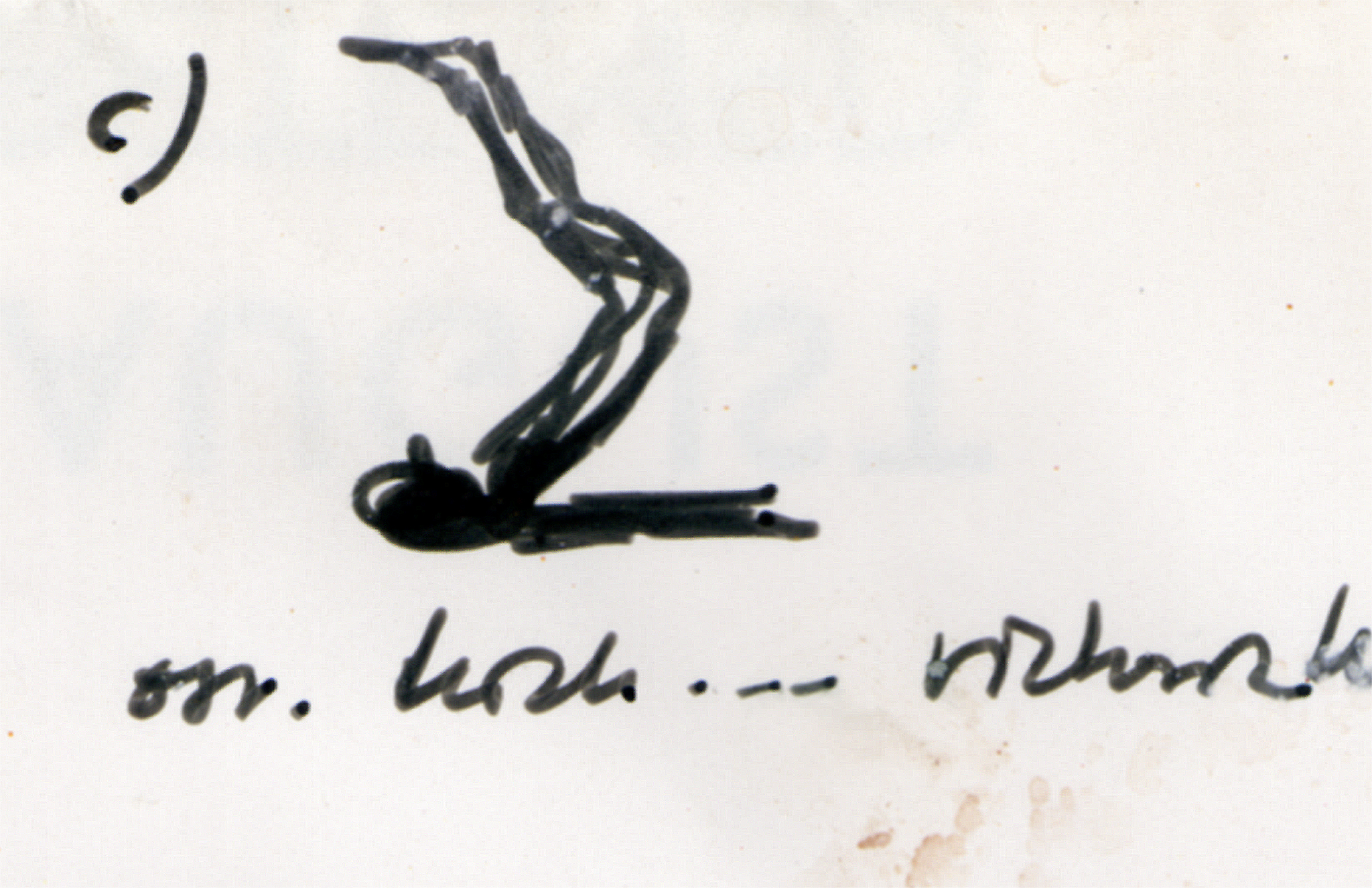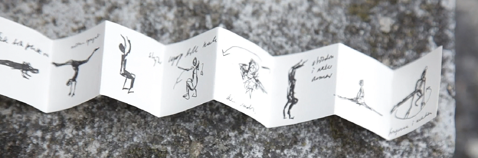 The sketches became keys to the work in the project Possible and Barely Possible Moves. Their expression of belief in the possibility of anything created an inspiring counterpoint to the limitations of my own physical body. A sketch of a movement exists somewhat independently of its original context. Just as letters in an anagram change places, or as when reading a word backwards, the sketches became impulses for exploring movements, rather than attempts to imitate something predetermined.