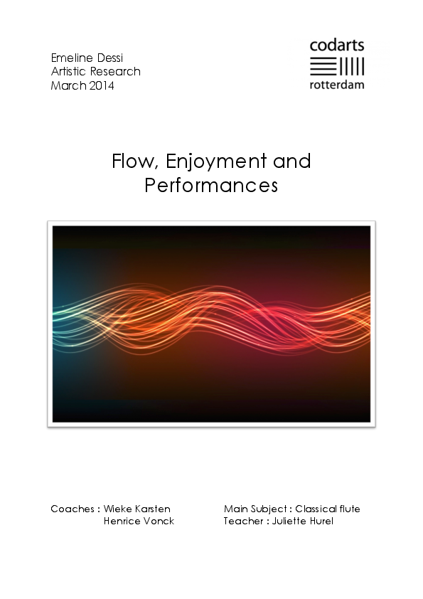 This research idea came to mind some time ago after I had lost enjoyment practicing and performing with my flute. I wondered, where the inspiration had gone that I used to feel and that had guided me to become a professional flute player? Some other questions followed: why do I feel great playing sometimes and other times not at all? Why am I not performing as well as I can play during practice? Around the time I started having these questions, I started to experience stage fright, which I had never before. This research refers to the subject of Flow and the road I took to reach that state. I organised this report according to the Artistic Research requirements of Codarts. I divided the research in three sections called cycles that contain zero-point recordings, feedback, data collection, intervention, endrecordings and results. The first cycle concerns grounding and body awareness, the second cycle refers to Flow in audition and the third cycle relates to the Mozart flute Concerto in G major k313, which is an important piece of the flute repertoire, and how I reached a Flow state playing this piece. At first with this research, I thought I would find techniques or exercises that would help me master my level of playing during performances and auditions. I actually discovered a much deeper inner-self and body-awareness. I found out that I am much stronger than I ever imagined. My experiments and results concern my playing and my personality and I hope this work will inspire people to seek their own way to Flow. This journey made me grow as a musician and as a person and brought Flow in my life, which has led to true and deep happiness.