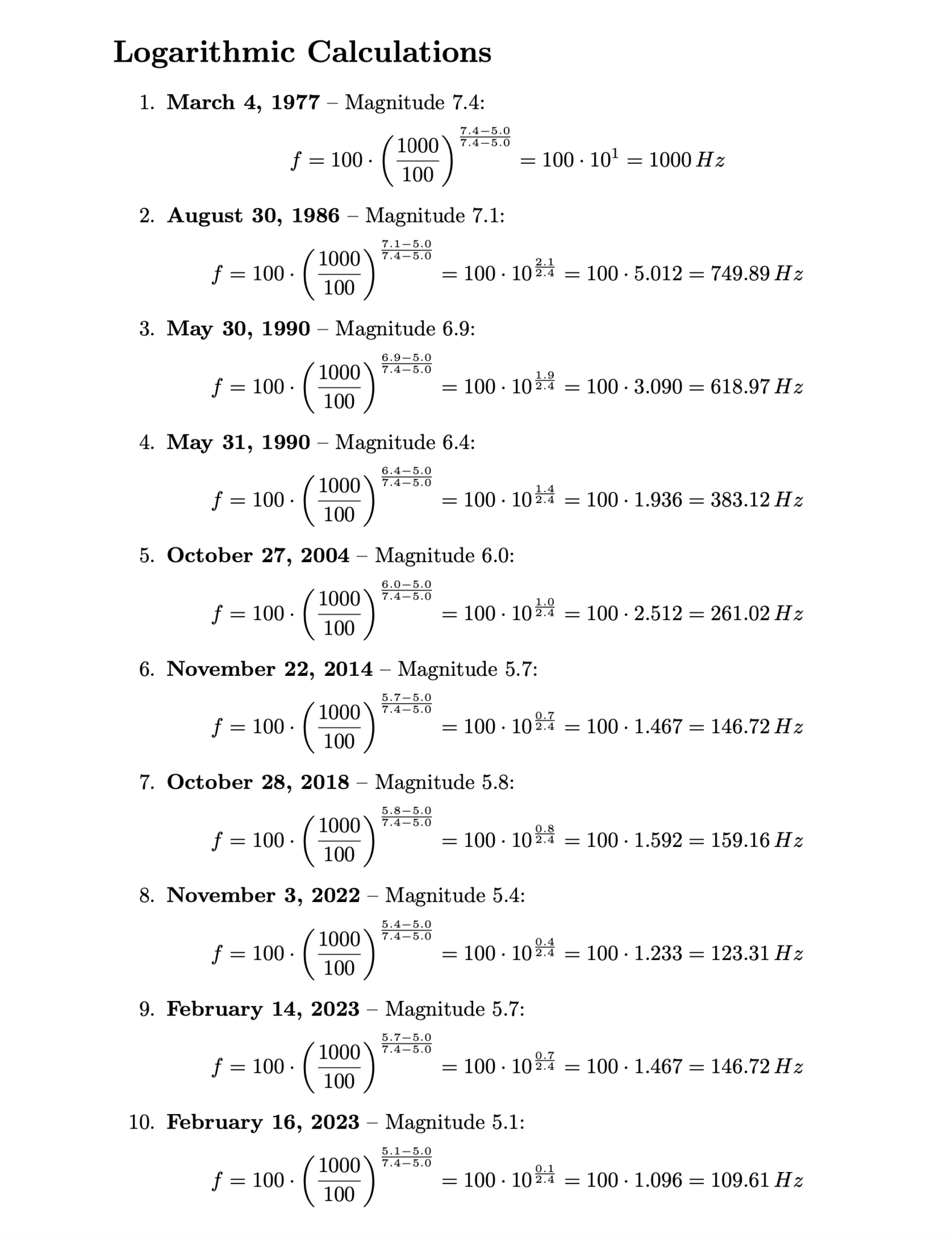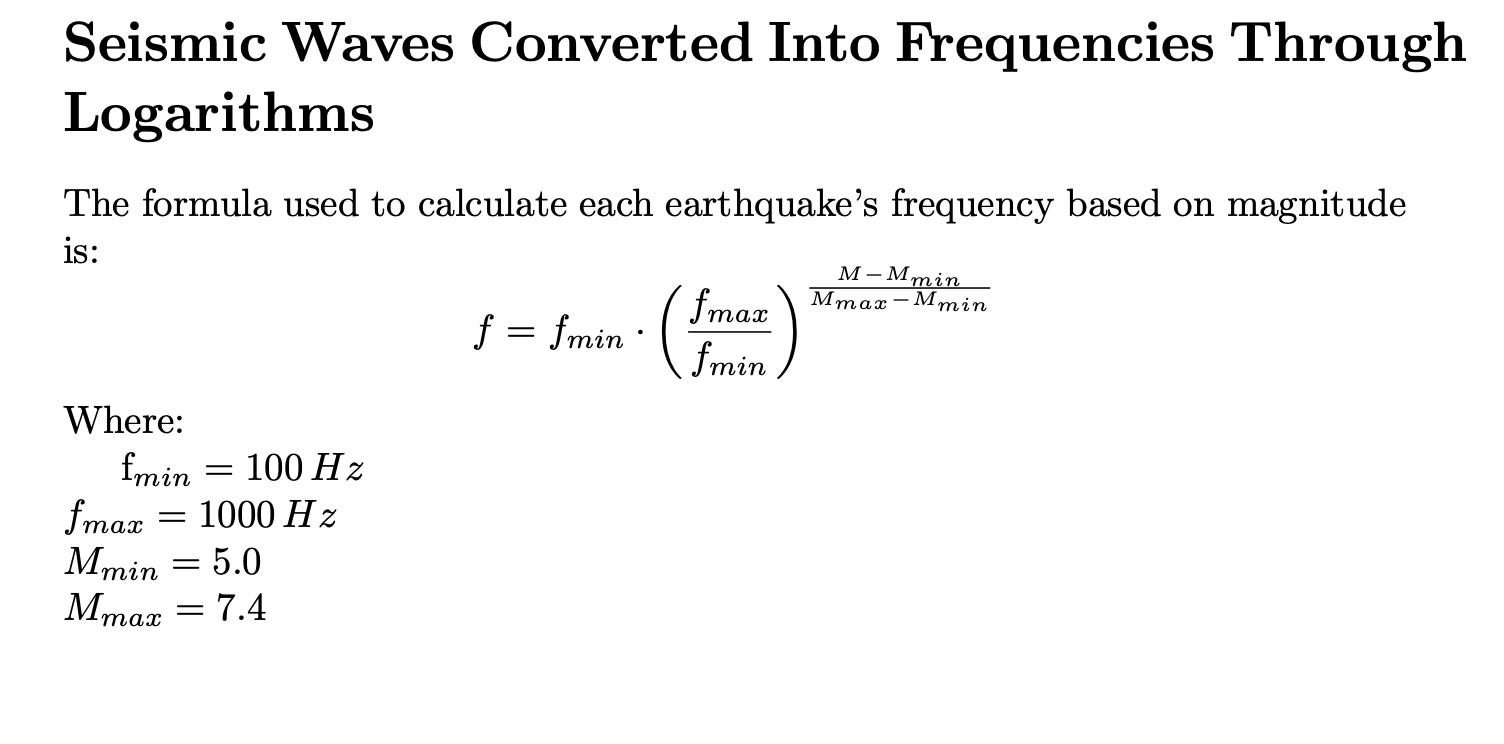 Here, f is the resulting frequency in Hz for a given magnitude M; the minimum and maximum frequencies (f_min = 100 Hz, f_max = 1000 Hz) reflect a perceptible spectrum, while M_min = 5.0 and M_max = 7.4 bracket the recorded events. This logarithmic scaling respects both the exponential nature of earthquake energy release and the logarithmic perception of pitch in human hearing, preserving intensity relationships rather than literal translations. The result is a perceptual field in which each seismic event is rendered not as objective data but as embodied pressure, relational intensity, and temporal contour. This perceptual scaling technique has also been used in auditory display design and psychoacoustic research, where logarithmic transformations enable intuitive human engagement with exponential phenomena9.