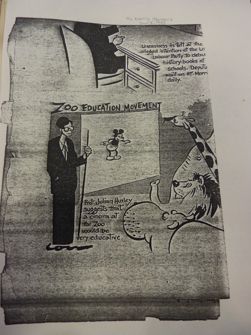 Figure 10: “Zoo education movement,” Julian Sorell Huxley – Papers, 1899–1980, MS 50, Series XI: Clippings, Box 136: 1909–1939, Folder 5: Biographical Materials, 1931–1939: The Evening Standard, Jan. 5, 1935. Courtesy Woodson Research Center, Fondren Library, Rice University.