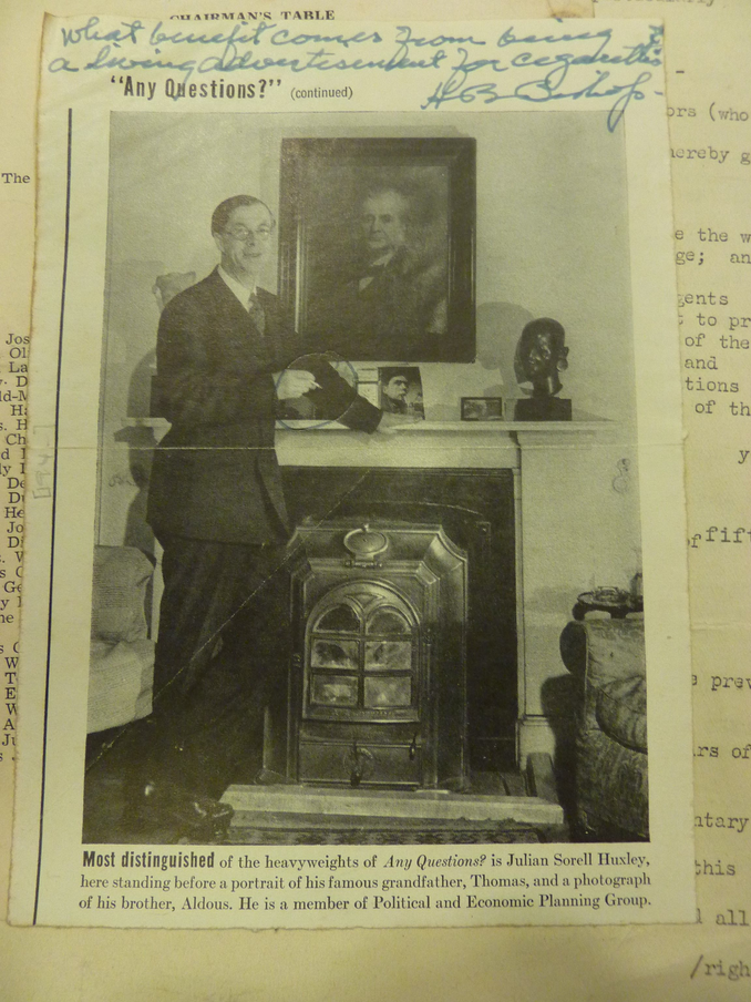 Figure 1: Julian Huxley under portrait of grandfather Thomas Henry (and next to a photo of brother Aldous), ca. 1941, Julian Sorell Huxley – Papers, 1899–1980, MS 50, Series XIII: Memorabilia, Box 150: 1940–1949, Folder 1: 1940s: “‘Any Questions?’” Life, May 17, 1943, 31–34, p. 34. Courtesy Woodson Research Center, Fondren Library, Rice University