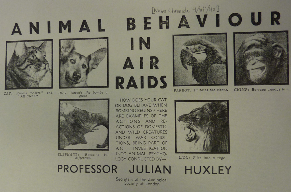 A special opportunity for Huxley to teach the public, in particular through animal vocalization, came with the outbreak of war. The war hit the zoo hard, and it severely limited Huxley’s research on animals.[7] Apart from the fact that financial constraints forced the Zoological Society to drastically reduce its staff, the most dangerous animals, such as poisonous snakes, spiders, and scorpions, had to be killed, and others, like the big cats, bears, and grown apes, were relocated to safer places. Indeed, cages and enclosures were hit by bombs, and animals escaped; those that posed a danger, and could not be lured back, had to be shot by the zoo’s Air Raid Precautions personnel.[8] People themselves had to seek refuge in the zoo’s shelter during air raids, where Huxley tried to drown out the bomb noise with the music of Sibelius – one of modernity’s euphonic aspects. However, in the midst of the tumult of the bombings and air raid defense, Huxley recognized the opportunity to observe the animals’ reactions. This developed into an exercise in mobilizing citizen scientists and one of his many attempts to convey moral lessons to the public via animals. Huxley published a questionnaire in the News Chronicle, asking readers to write down their observations and send them to him: “How does your cat or dog behave when bombing begins?” Not only did Huxley’s own parrots scare people by imitating alarms; some birds and other animals even burst into hysterical screaming. Nevertheless, Huxley’s conclusion was that animals in general remained rather calm amidst the noise of raids.[9] His own observations in Regent’s Park Zoo confirmed this. In one instance, the Camel House was severely damaged, “yet the camels were sitting in their now open cage as if nothing untoward had happened!” (Huxley 1970: 255).