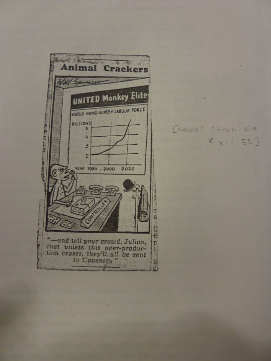 Figure 11: “United Monkey Elite,” Julian Sorell Huxley – Papers, 1899–1980, MS 50, News Chronicle 8 vii 55 ??. Courtesy Woodson Research Center, Fondren Library, Rice University.