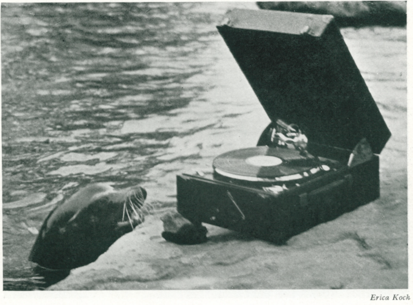 Songs of Wild Birds (Nicholson and Koch 1936) and More Songs of Wild Birds (Nicholson and Koch 1937) were a great success. They contributed to what one might call the war on noise and the attempt to preserve natural soundscapes. Nicholson had included an appendix in the soundbook with guidelines to the reader about methods of listening and recording birdsong. The books were thus connected to the British Trust for Ornithology’s attempt to mobilize hobby ornithologists and to its nationwide birdsong inquiry that ran from 1937 to 1940 (Bruyninckx 2012: 61-62); they were also connected to the understanding that Britain was in the course of losing the diversity of its wildfowl. Bird recordings were played in schools and public gatherings (listen to the example of the nightingale in AudioObject 1: “Ludwig Koch and the Music of Nature,” BBC online, at 10:30, 13:00, 15:45 minutes), and a Morning Post journalist, excited about Nicholson and Koch’s project of a “Library of Bird Songs,” reported that an extinct bird had performed before the Royal Society of Arts.[5] Somewhat sarcastically then, the recording projects had a touch of “salvage ethnology”: they should preserve the birdsongs before they could no longer be heard in nature. A special contribution to the preservation of the acoustic world heritage eventually came from Huxley and Koch’s soundbook, the first in the English language to contain vocalizations from mammals. Animal Language (Huxley and Koch 1964) was recorded at the London zoos and written by Huxley.