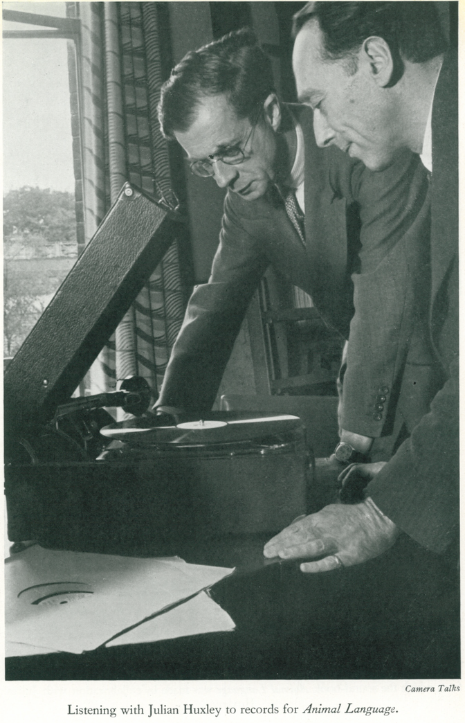 Figure 6: “Listening with Julian Huxley to records for Animal Language,” in (Koch 1955: facing p. 49)