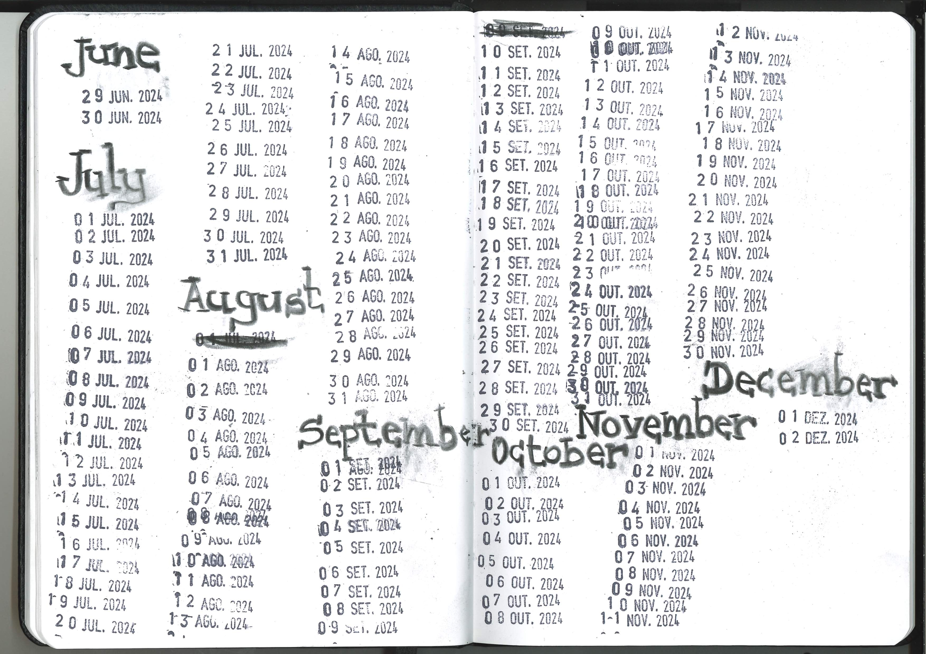 Aware that the act of forgetting is something that often simply happens, I start a daily practice: at the end of each day I sit down, stamp a date on a notebook page and take note: Do I still remember? I write using charcoal, a material that has little permanence. To work with charcoal is to constantly fight its desire to go away. Every night I take the time to see if I can still remember what I would like to forget. I know how to remember, I don’t know how to forget. I do nothing to forget, I simply let time pass and register the presence of this thing I now know. I don’t know how to actively forget, and I choose not to learn ways to do it. I wait for it to happen.