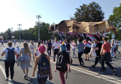 Parody, satire, humor, and elements of carnival were often present at the demonstrations (Lidski 2022), and many people criticized the Belarusian protests for being too peaceful, too creative, and too colorful – carnivalesque. I wouldn’t equate these subversive demonstrations to carnivals that often have a legitimate place in a social and political order. Carnivals are limited in time, are a part of the system, and can reinforce it by providing a temporary release of pressure that would otherwise threaten the system.