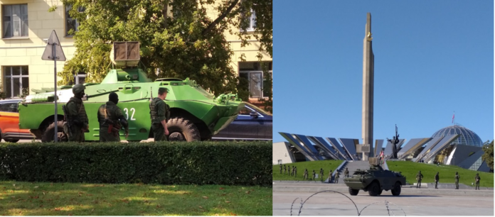 These vehicles were deployed near the Victory Square and in front of the Great Patriotic War Museum. Both places feature war obelisks and have a “sacred” status due to the central role of the Great Patriotic War (WWII) in the current state ideological discourse. These locations defined the armored sound systems’ playlists, an eclectic mix of Soviet military songs, music by contemporary Belarusian and Russian military pop-bands (what I call paratrooper or commando pop), mellow folk-rock from the 1970s-1980s, and the newest patriotic hits by musicians loyal to the state. Sometimes the effect of the “singing tanks” (as the protesters called the machines) was rather comical; people laughed at songs, some couples even waltzed.