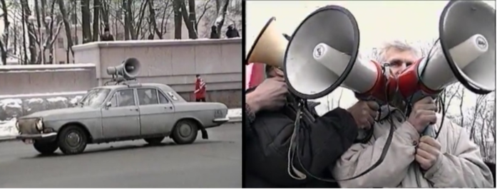 A milicyja car with a loudspeaker and protesters with megaphones at a rally dedicated to the 50th anniversary of the Universal Declaration of Human Rights, Kastryčnickaja Square, Minsk, 1998. The speaker was Aleś Bialacki (Bialiatski), who was awarded the Nobel Peace Prize in October 2022 while being in prison. The screenshots are from a video by Siarhiej Chyryk, a democratic activist and camera-man who died in December 2023; since then his online video-archive disappeared.