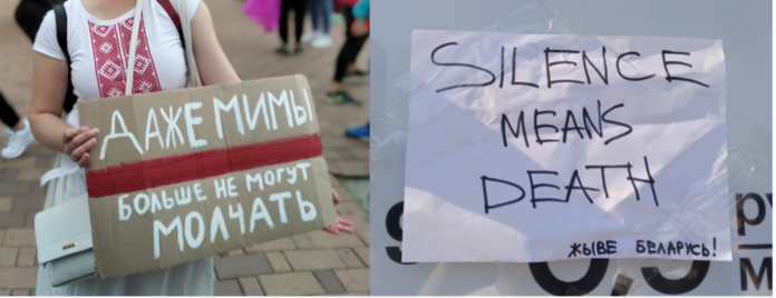 “Even mime artists can’t be silent anymore”; “Silence means death”, Minsk, August-September 2020. Photo: P. Niakhayeu.
