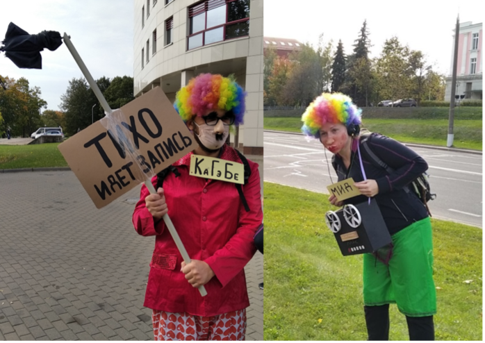 This atmosphere of total surveillance and wiretapping was often mocked in memes and performances. The “Mike & Nick incident” in September 2020 generated a flurry of jokes. During one of the protest demonstrations, a trio of protesters came dressed as clownish-looking agents of KGB, the Internal Affairs, and the Foreign Affairs Ministries prowling with microphones, antennae, and a tape-machine. A few kilometers later they were detained.