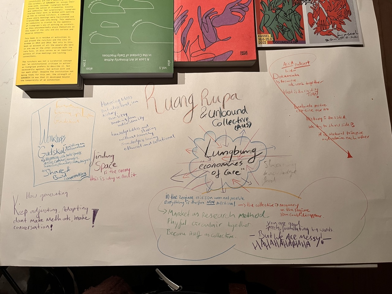 I started googling and found a lot of different sources, i feel mainly from the same angle and I have tried to form a base of sources that I could draw from. From skimming a Master Thesis, reading upon the earlier Sonsbeek collaboration, listening to podcasts on Ruangrupa and Unbound collective by the Australian Centre of Contemporary Art(ACCA). Discovering on the 'praxis'(counterintuively called 'praxis') of nongkrong, gudskul and lumbung, of which the last reminds me of Mladen Stilinovic's In praise of lazyness. Which was written on the wall of Moezeum.