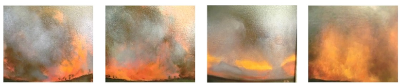 An illusion of depth was perhaps more profoundly demonstrated by Baroque painter Michelangelo Caravaggio’s (1571-1610) use of ideas of extending perceptions in his painting David and Goliath (1609-1610)[8] in which Goliath’s head is presented as emerging from the picture plane and into the beholder’s space.[9] Here, the profundity of fiction reaching into reality—as understood within the context of displacement in space, and by extension as reconstituting the most essential attributes of existence—unlocks new possibilities for depicting the limitlessness of time in space.[10] This concept of displacement as analogous to Newton’s seventeenth-century conception of gravity becomes a force determined by the laws of motion and mass that was later attributed new meaning by Einstein’s famous reformulation of space, time and motion in his idea of the fourth dimension.[11] Caravaggio’s idea of extending perceptions underpinned my conception of time passing through space in my Tongues of Fire series (2012-2013) as clouds of smoke and fire reaching into the viewer’s space and in doing so, linking illusion with reality just as painting becomes a vehicular medium with which to link the idea of painting to the painting itself. I believe that this notion of extending perceptions can potentially unlock optical illusions that imply movement, and therefore sensations analogous to the passage of time.