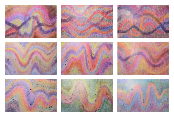 A longstanding appreciation of Pollock’s pictorial strategy implicitly underpins my own conception of time passing through space in my Ripples series (2009-2011). Here the unseen trajectory of time is traced as undulating mirrored lines that converge and separate in order to elicit motional effects—an idea triggered while observing the movement of water on a windy day in a lake. Each movement of line is manifested as temporal succession, and the ebb and flow of the ever-changing and never ending continuum of the passing of time in space. The individual paintings and the intervals in-between are therefore effectively operating within a grid, partitioning wholeness in which the next move indicates infinitely changing yet connected moments in space. As a result, the painting process is inextricably linked to a metaphorical extension of the predictive process of transformation through experimentation with painting materials and techniques to strategically structure new ways of conveying the invisibility notion of the passage of time in space