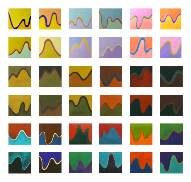 Among these artists’ examples of spatial representation Hofmann’s idea of push and pull effects inspired my conception of time passing in Sinuous series (2009-2012) as undulating mounds that seem to mirror sine waves typically seen on an oscilloscope[28]. These sinusoidal waves, when described mathematically, represent repetitive oscillations that can create illusions of rhythmic effects that play spatially within the picture plane, and although they are not literally substantiated, they are assumed to be connected. The liminal spaces between rhythm and stillness are suggested by the dynamic flow of line and colour against a static monochromatic background. While the interlocking of flatness and depth in Hofmann’s painting The Gate seem to converge into a single entity, the spaces in Sinuous—being inspired by non-Euclidian geometry and quantum fluctuations[29]—were conceived as infinitely flowing beneath the grids, resembling a sense of continuity associated with the passage of time in space.
