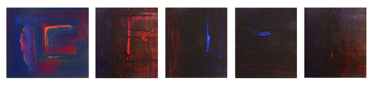 Buren’s conception of serialisation inspired the projection of time passing through space in Slices of Time – Fragmented Space Series (2010-2012) as progressive fleeting segments of light that resemble motional effects. In this succession of chronological events, each pictorial moment is selected frozen and displayed in series in order to anticipate a fictionalised sense of the passage of time. This serial representation of temporal motion can be understood as one way of aesthetically historicising the passage of time within static imagery that entombs its memory. Here, the dialogue between grids and intervals allows fractioned units of information to operate within a sense of wholeness. Hence, visualisation in series offers a model through which each painting becomes part of a conversational vocabulary of thought.