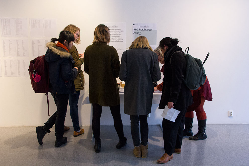 Walking with Yiddish is a project with visual communication as it´s starting point. The project is dealing with text, subtext, context, source processing, visual rhetoric, semiotics and documentation. Thoughts in transition: A mind is a conversation, a discussion, a written text, identified through materiality. Mapping with multinarrativ strategy, to find what is not so obvious. In handover; what form has the unknown and indeterminate, as spoken text and as the materialized idea of a text? How can a submitted text be reflected in the fellow human it is available for? The project explores language as a visual and textual dimension between people, when design is a result of mirroring ´the other´. How can empathy be a premise for establishing the design or artwork? What is and how does the scaling of empathy occur, and what occurs when empathy is scaled?