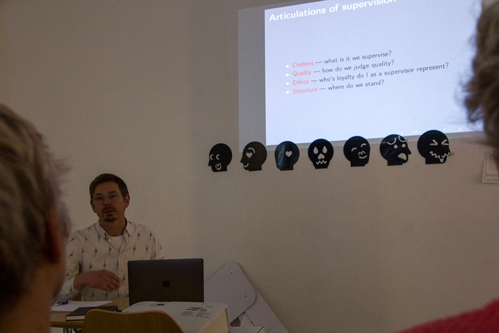 (Language: nordic. Moderator Bente Irminger): Supervising, seminar and discussions with Henrik Frisk: Research through design and the supervising of reserch fellows. How to combine theory, methods and practice? How to balance individual and group supervision? Cooperation between superviser and second superviser. Common meeting points.