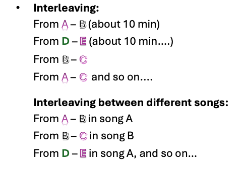 Since I earlier had introduced my mentees to "Interleaved practice" as a practice method, I used this method throughout this session; A maximum of 10-12 minutes on each part I practiced before I jumped on to another part of the song. This is a method that is increasingly practiced in schools, and of course it also works in choirs. The starting point for the method is recent brain research that says that the brain must be stimulated with something new after about 10-15 minutes. Two sources I lean on in this my own development of rehearsal methods are Daniel J. Levitin's "This is your brain on music" (2017) and Sharon Paul's "Art and Science in the choral rehearsal" (2020). To the right is an example of how to work with shuffled learning, and reflects how I myself carried out the exercise: