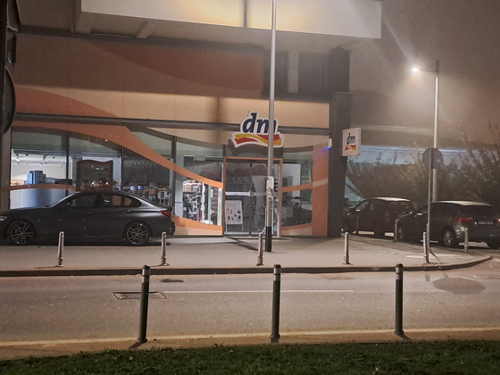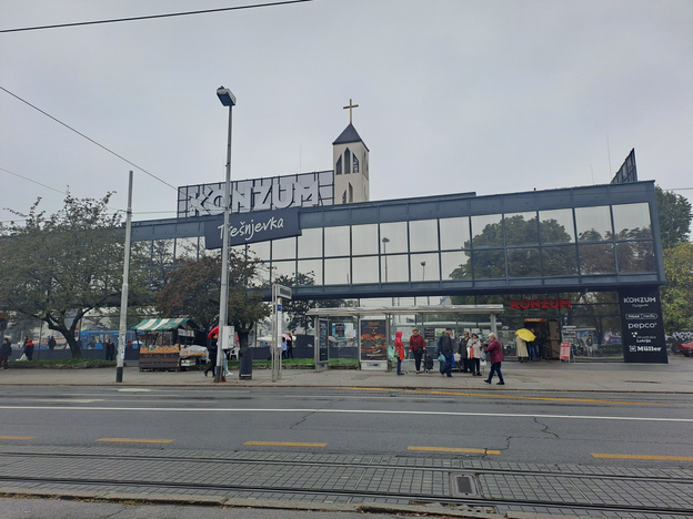I perceive a big building, ex Nama building, which is a Konzum store today. It has huge reflective glass panels.