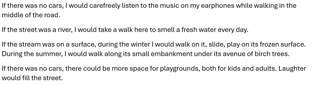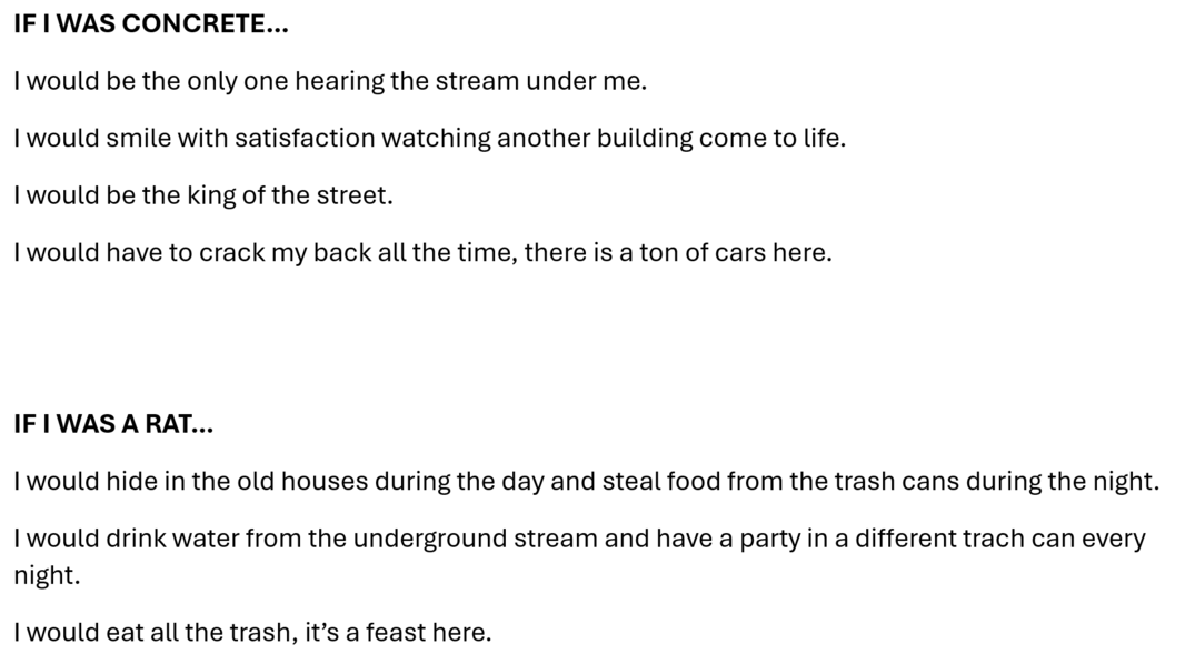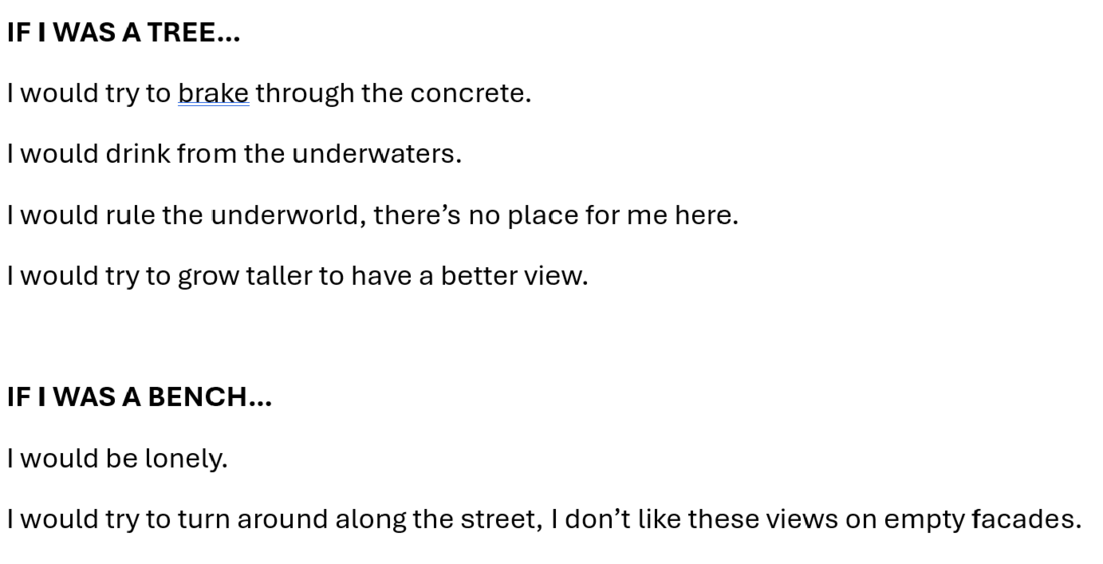 The experiment aimed to rethink the characteristics of the street from a third-person view (animal, plant, object), to offer suggestions of placing yourself somewhere in the street and experiencing an interesting detail, and to offer a complete reimagination of the street together with different sensations this reimagination would bring.