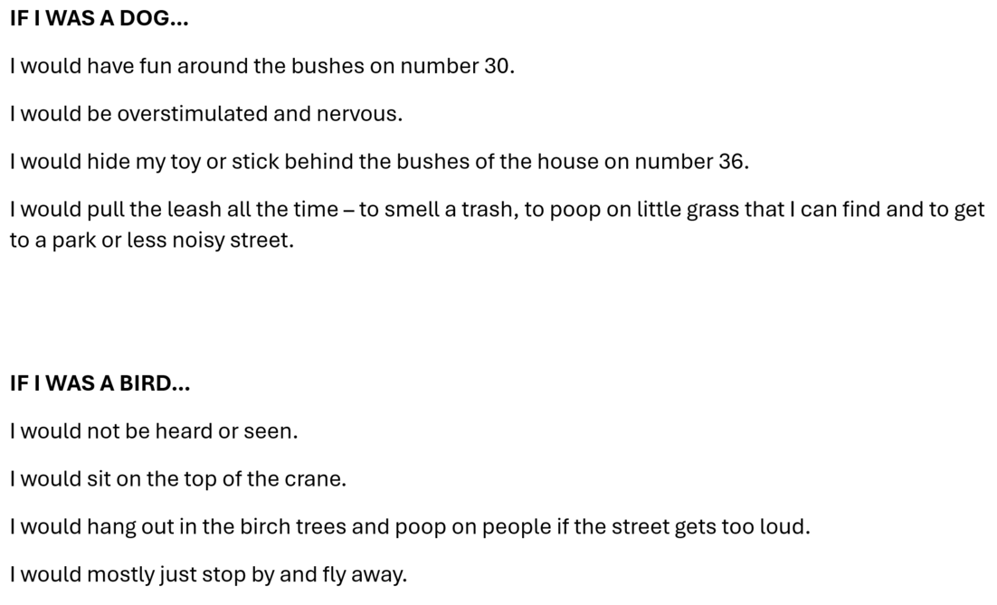 "While we were mapping the sound in the previous tasks, everything seemed very mechanic and cold. Now, when I was participating in the movement, I felt like I was zooming in on the conversations that encountered me as an organic part of this space - I heard someone's child had smallpox for two weeks, two girls deciding where to sit for a coffee, people fighting on the tram entrance."