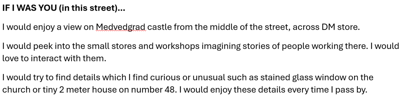 Reporting about the current atmosphere of the street (busy hours, working day), observing which type of social contact, movement, and needs are supported within this street, and reflecting on our sensations while staying in the street.