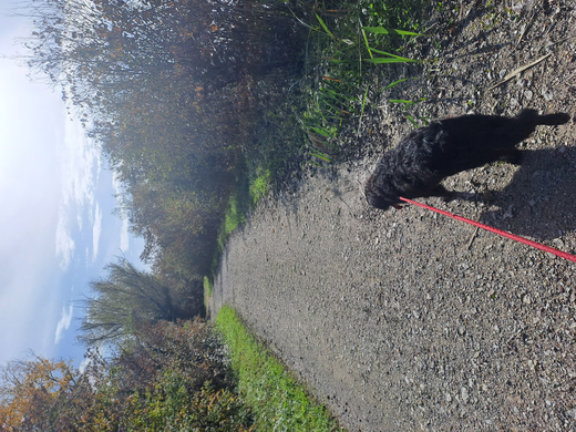 We are encountering the limit - there is a warning at the location that all the dogs have to be on a leash today since there is a fishing competition in progress. From now on, I'm carrying Mina's energy close together with mine.