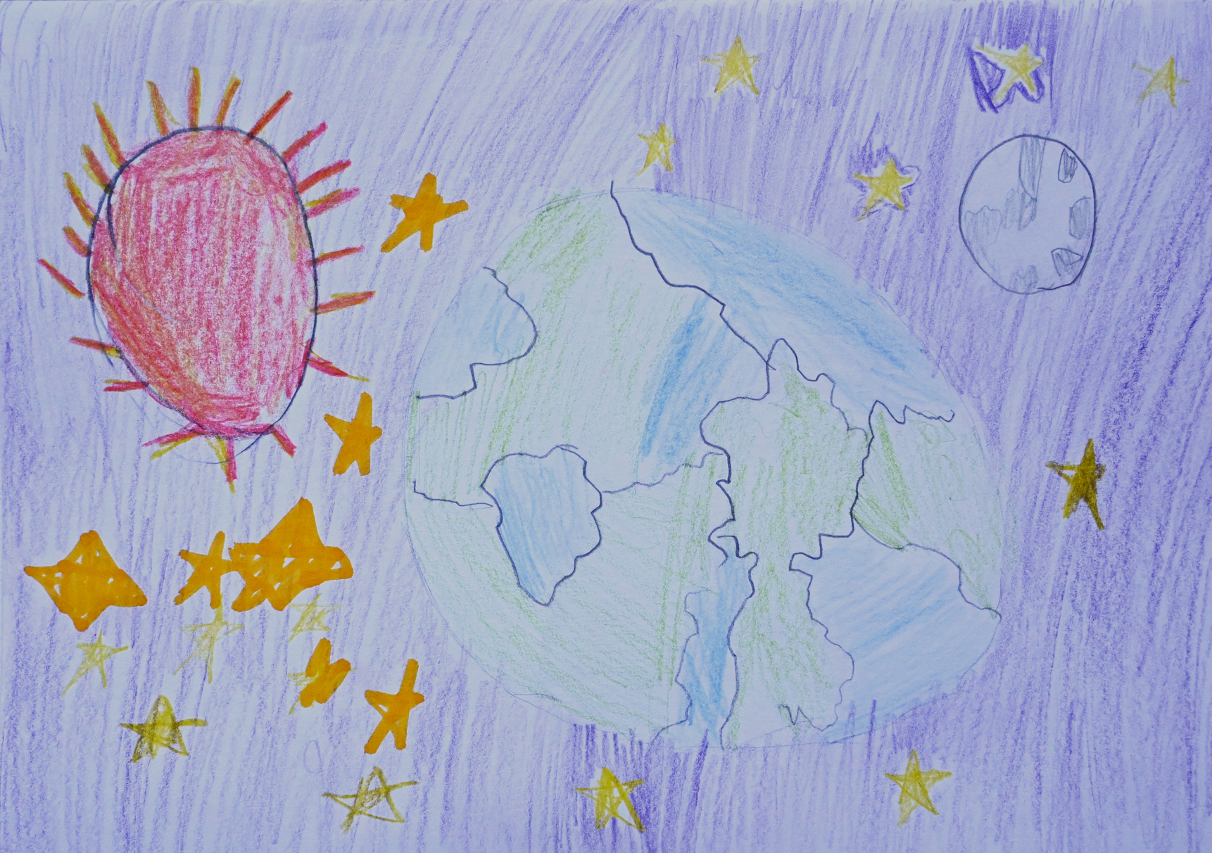 From afar, the Earth floats quietly in a purple sky, surrounded by stars. The sun burns fiercely on one side, while the moon glows pale on the other, holding balance across the distance. It is a moment before something begins. From this perspective, Earth seems large and exciting, shimmering between light and shadow. The scene feels like a prelude: something is waiting to be heard.