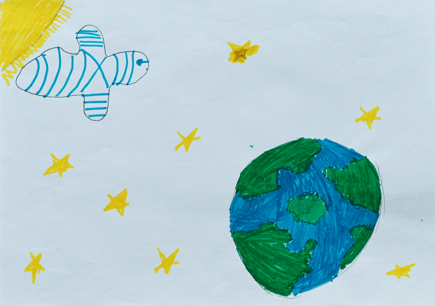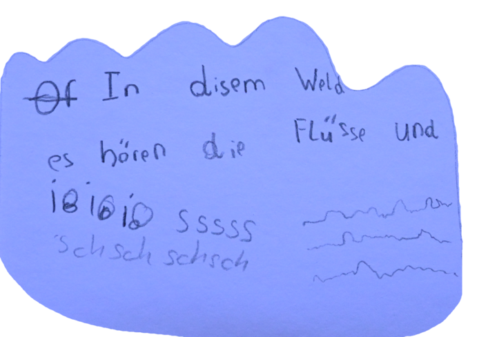 The heat of the sun softens. The stars thin out, and the sky turns bright. From the quiet, a white-and-blue object appears. Part bird, part spacecraft, circling the Earth. It approaches slowly, curious and deliberate, as if guided by sound. The words on the accompanying score: “In diesem Welt es hören die Flüsse und iOiOiO ssss schschschsch”, suggest a world where rivers, air, and static noises all listen and speak. The spaceship seems to carry this with it while searching for a place to land.