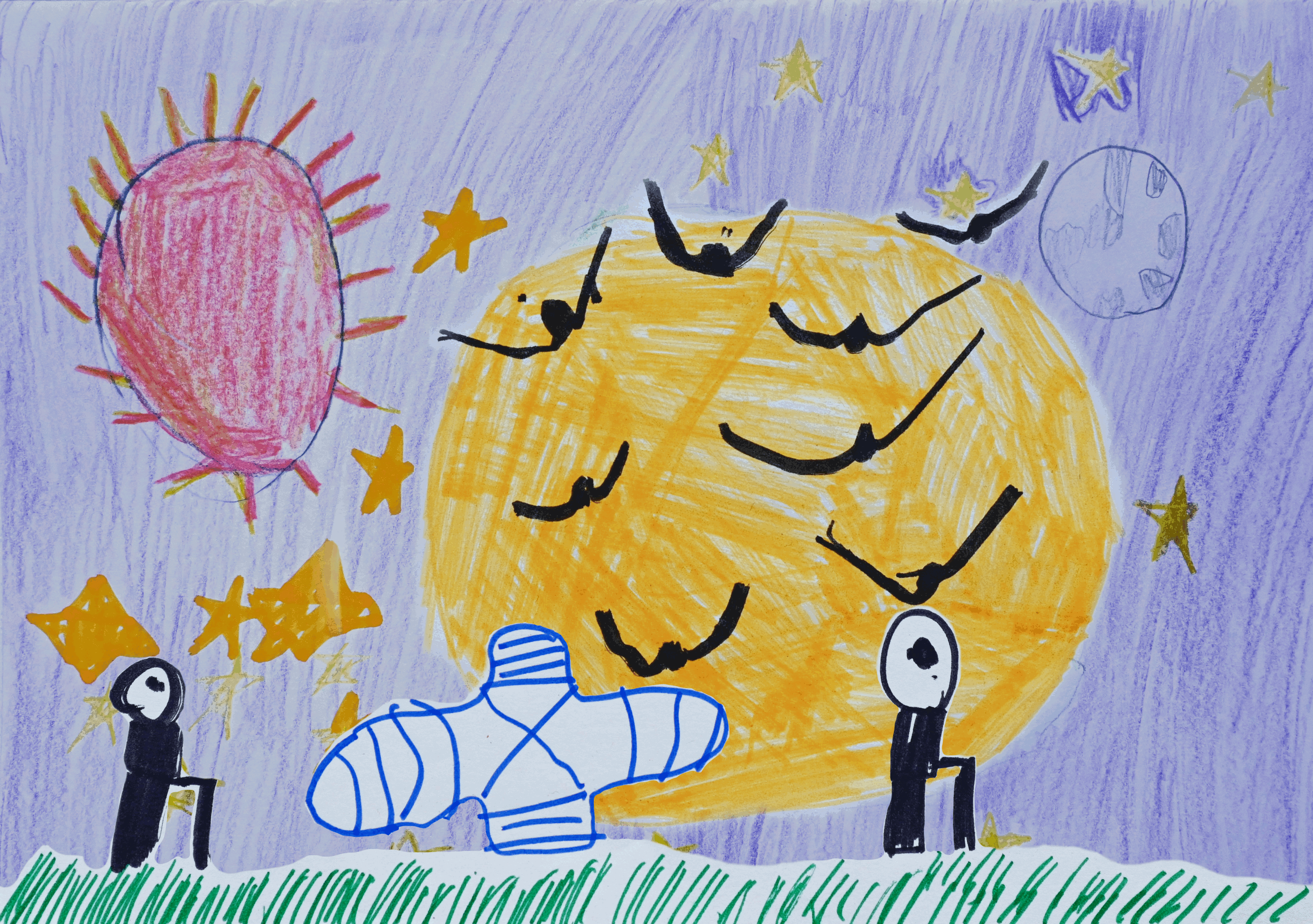 This sub-project by Mbappe and Alx unfolds as a visual and sonic narrative in four parts. Through drawing, sound design, and storytelling, they created a world that moves between outer space and earthly encounters. Working with the Koala app, they designed soundscapes to accompany their images, combining rhythm, texture, and voice. Each drawing reveals a different moment in an unfolding story, from distant observation to arrival, contact, and transformation. The result is a world both imagined and heard, where the boundaries between the real and the speculative begin to blur.