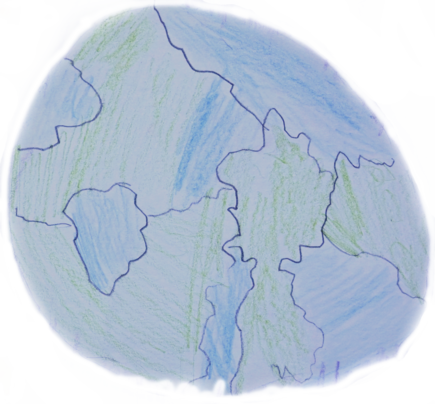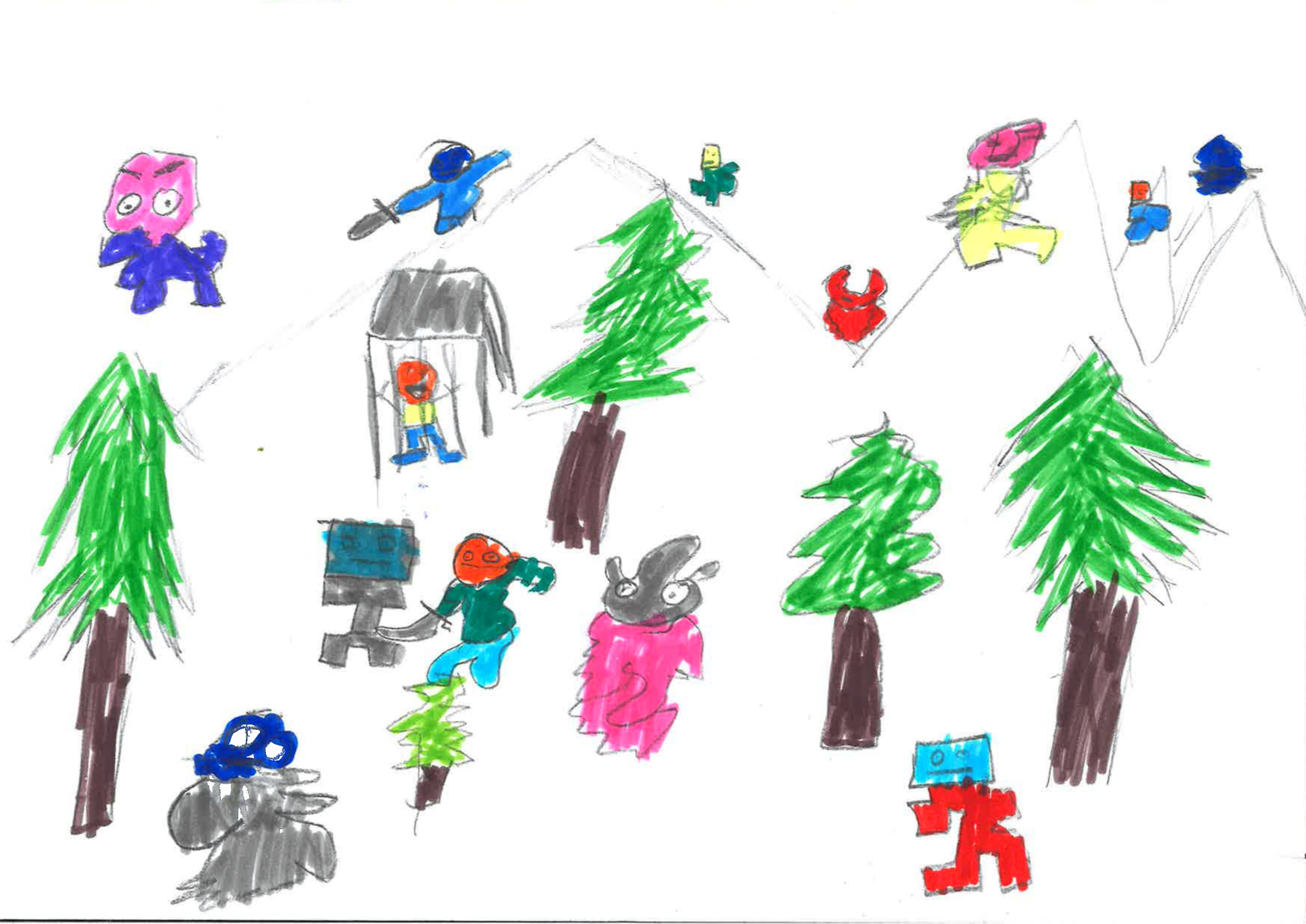 The world has drastically changed. Many creatures now fill the landscape, some gathered peacefully, others armed, guarding, or hiding. Mountains rise like borders, trees like witnesses. One figure hides behind lines that look like a cell, or maybe a structure of protection. It is no longer clear who belongs here and who arrived later; the world has become layered, full of difference. What began as distant observation has become a living, complex planet, one that continues to vibrate with sound, movement, and the unknown.