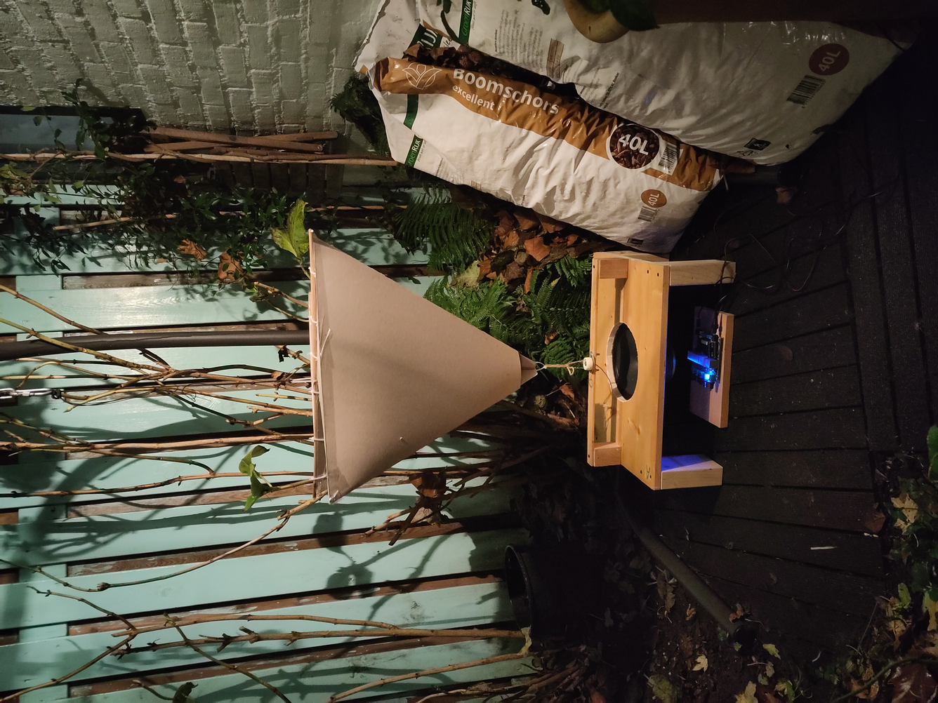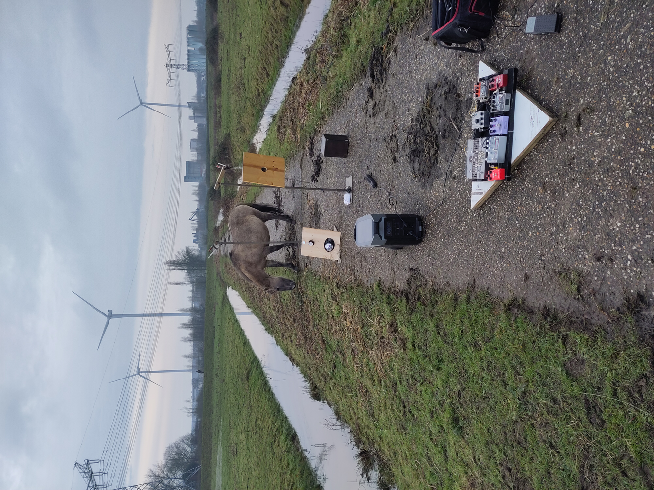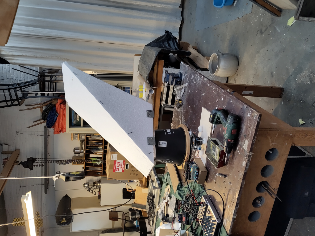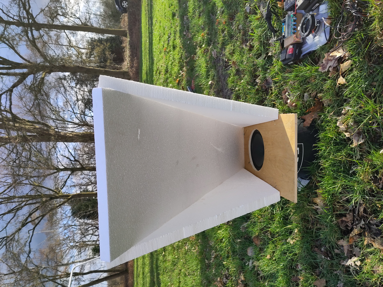 We hooked up some sound equipment to a battery and tested speakers. Trying out different angles, postions and reflective materials.