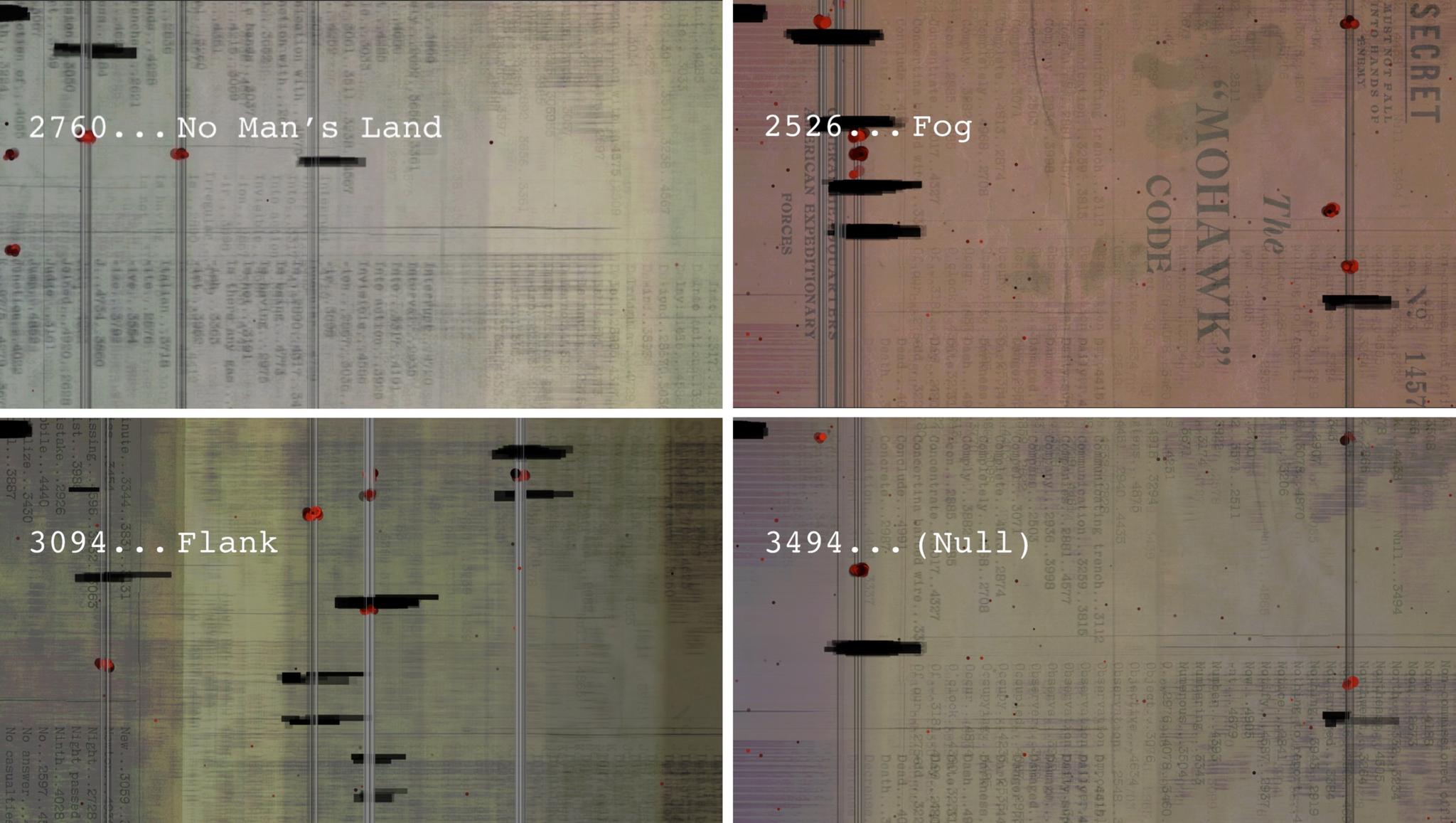 The piece utilizes three code books: The Mohawk Code (US, 1918), Schlüsselheft (Germany, 1917), and the BAB Code Book (UK, 1917). Each book is translated into an audiovisual media score, played back through custom Java software, and inhabits its own distinct sonic and visual world, reflecting the unique characteristics of the original code books. For example, The Mohawk Code, based on a 1918 trench code book issued by the American Expeditionary Forces, is divided into two main sections: one for encoding messages and another for decoding them. In this score, the entire "decoding" section is used as a dataset, with its content encoded into the graphics according to specific rules.
