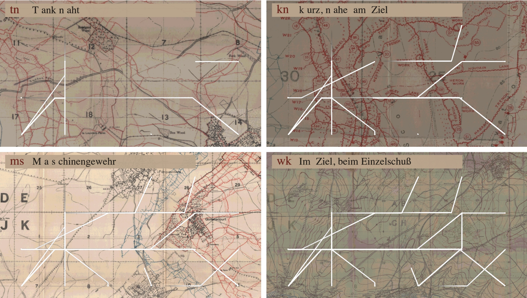 Most of my own work thrives on these metaphoric relationships, trying to generate meaning between the various media. Specifically, how hierarchies shift between auditive, visual and textual. Trench Code (2015), commissioned by Brugge Concertgebouw for the anniversary of the 1st World War, plays on these shifts of hierarchy. It consists of 3 interactive videos, which act as scores and instruments for an open ensemble. Each video is based on a particular code book used in the trenches, presented in a graphic form and encoded into musical material. A communication system is set up amongst the ensemble, utilising the vocabulary and codes found in the three trench code books. The scores are partly computer generated, though always relying on the encoding of the text as it appears in the books, and on the operation of a score-player[6].