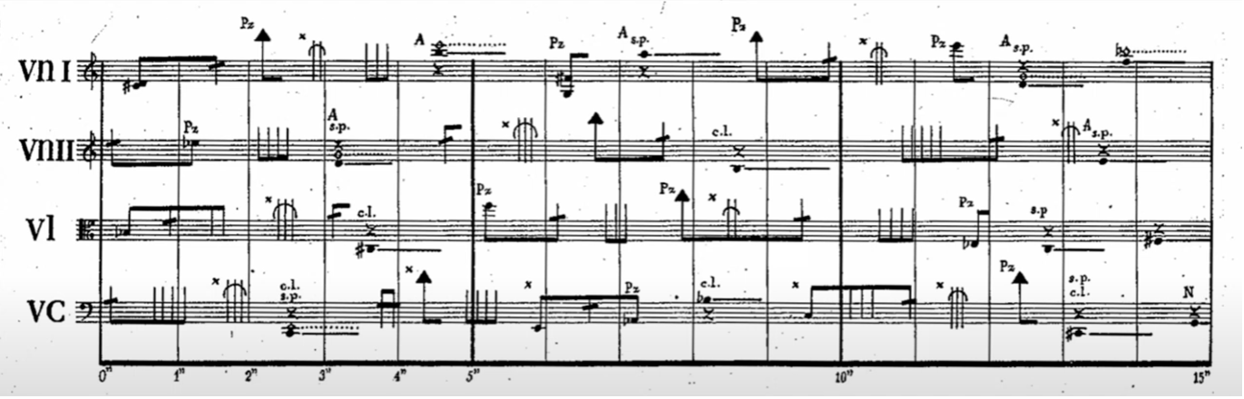 An example of the performance of a work that was never intended to be used as a projection, but because of its peculiar graphical beauty, gives an audience an insight into the workings of notation is the Kronos Quartet’s performance of Krzysztof Penderecki’s Quartetto per archi (1960)[4]. The score is rendered in scrolling form, with colours inverted (black background with white notation), with a red vertical stripe in the middle letting the musicians and audience know what is being sounded at any given moment—a karaoke version. This simple device of animating the score, not only helps the musicians synchronise a relatively arrhythmic musical texture, but also demystifies the music for the audience.