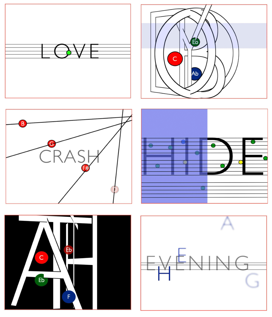 The fragmented lyrics are not meant to be sung but rather read by the audience (or sung internally through their "inner voice"). Each movement is designed for a solo instrument, accompanied by an open ensemble. References to famous songs appear within the lyrics and sounds, though they are never explicitly revealed. The score provides ample space for improvisation by the soloist and ensemble. However, because of the text's prominence in the visuals, the audience is not overly focused on the relationship between the score and the performance. Instead, they are invited to experience the media score from a fresh perspective.