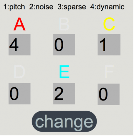 Two interesting contemporary examples of using interactivity to navigate within a score are Anne La Berge’s Raw, and Maya Verlaak’s Us butterflies. In Raw[2], musicians interact through a score interface which lets them know if they should play, and if so what kind of material: pitch, noise, sparse or dynamic (see below). These kind of parameters (two nouns, two adjectives) stem from Anne La Berge’s background both in improvisation and electronic music where there is enough space given to the performer to interpret, but where the contextual meaning is very clear. The beauty of the piece lies in the interaction of the performers. Each player has the ability to change the current instrumentation selection, by pressing “change” on their iOS score interface. This randomly shuffles the selection, and at the same time, triggers voice samples (quotes by members of MAZE about what the concept of ‘Raw’ means to them).