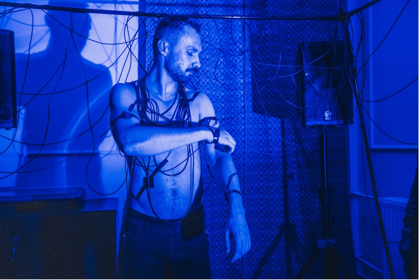 In his installation Touch Me, presented at the Warsaw Autumn Festival 2023, the audience engages with a tactile installation integrated into a performer’s body, where every interaction resonates with amplified and transformed sounds. Using haptic sensors and contact microphones, the touch of the audience, either directly on the performer, or through the construction of the installation, effects the actions of the performer, and the resultant sound heard through the speakers. This work examines touch as both an intimate source of sound and a channel for human connection that is often constrained by societal norms.