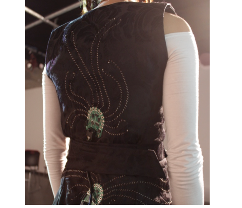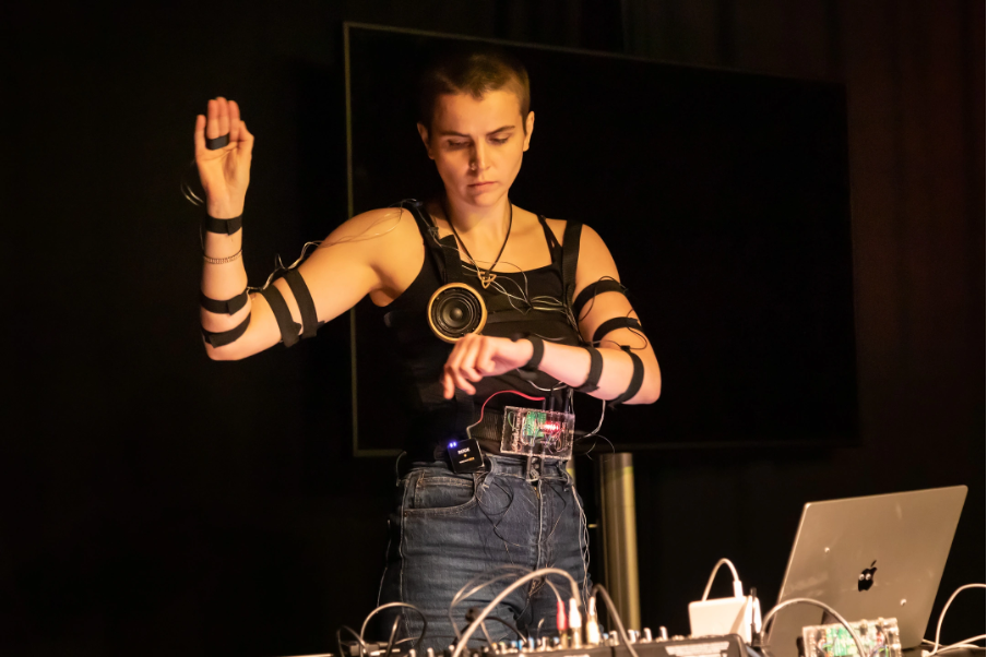 Another approach to wearable instruments is as an interface to translate the movement of the musician to sound, where the body is as both a receiver and transmitter of information. This is an area explored by Icelandic multidisciplinary artist Sól Ey. In her ongoing work Hreyfð (2021-) she designed a wearable gestural instrument that uses microphones, speakers, a microcontroller, and gyroscope signals to create and manipulate audio feedback[6]. With speakers attached to the body, the performer becomes the sound source, transforming physical gestures into a sonic choreography. The proximity of one performer to another can also affect the resulting sound, because any sound can enter any microphone, so the strategy of how the performers relate to one another becomes an aspect of the score that the performers have to be aware of, and can manipulate.
