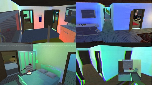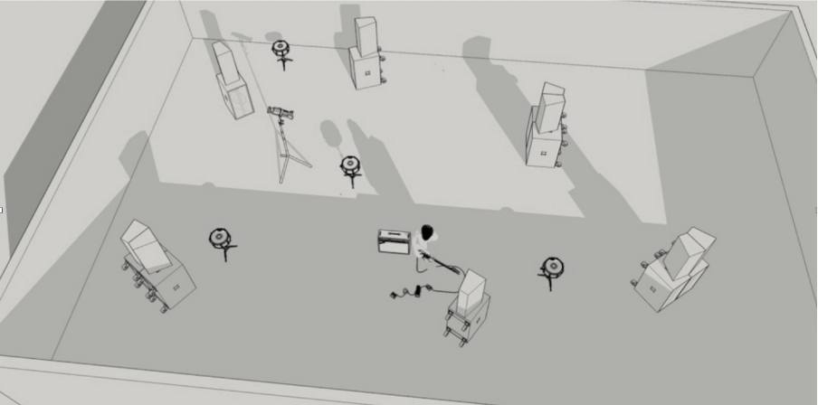 Marco Ciciliani is a composer who has explored this kind of work in several pieces: Kilgore, Anna & Marie, and 11 Rooms. 11 Rooms[3] is a multidisciplinary concert piece that explores the interplay between private and public spaces. Created for the saxophone ensemble KLEXOS, the work integrates video footage of the musicians’ daily activities with a virtual 3D house that is navigated live during the performance by what he names as a “media artist”, alongside the four saxophonists. Within this virtual space, sounds and actions encountered are manipulated in real-time by the musicians using their saxophones—not as traditional instruments, but as resonant chambers to shape the electronic sounds (talk-box and megaphones are attached to the instruments). In this way, the main score of 11 Rooms is a navigable virtual space, that generates sounds to be interacted with by the musicians. The media-artist who is the game-player in the piece, takes on the role with the greatest agency in the work, while the musicians navigate dual roles, serving as both subjects within the virtual space and performers outside it.
