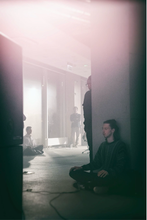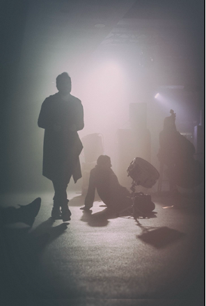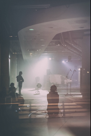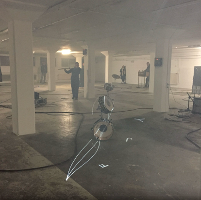 In 2017, I had the opportunity to develop an audio-visual work with artist Konrad Smoleński that dealt with how a score can be mapped in a space. Trackers was created for an open instrumentation, speaker installation, visual objects (including drum kit dispersed in the space), lights, video projector, and smoke machine.