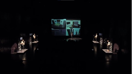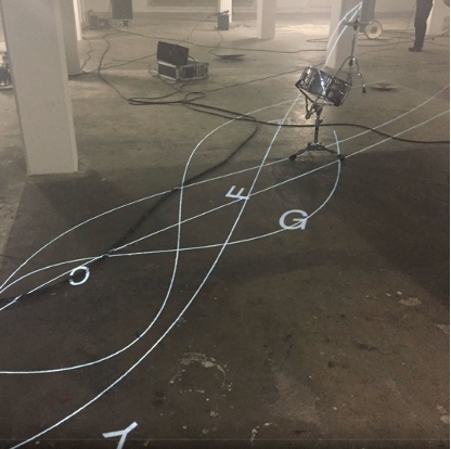 The music notation in a form of video is projected from ceiling to the floor of the performance space with the accompanying multi-channel soundtrack synchronized. Musicians follow the notation playing the letters as they appear, finding ways to interpret the interaction between lines and symbols, and using any features in the space to help this reading of the score. Objects, sounding or otherwise, are used in the space to create situations whereby the interference of score and space is enhanced. A dispersed drum kit, cables and speaker installations that correspond to the number of musicians playing are positioned in the space in a way that there is no space separation between the scene and the audience.