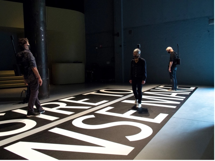 The text “DESIRE TO SENSE MAKE” is printed on the floor, with a software system linking its written phonemes to pre-recorded spoken phonemes. This text, and its virtual mapping acts as the score. As visitors or performers engage with the text, their movements across it trigger corresponding sounds from wearable loudspeakers, each emitting a unique voice. There is a direct relationship created between their position on the text and the spoken sounds they produce, effectively allowing participants to "step through" the spoken text as they walk across the written words. Sambolec writes about the piece: